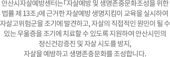 - 안산시자살예방센터는「자살예방 및 생명존중문화조성을 위한 법률 제 13조」에 근거하여 생명사랑 자살예방게이트키퍼교육을 실시하여 자살 고위험군을 조기에 발견하고, 자살의 직접적인 원인이 될 수 있는 우울증을 조기에 치료할 수 있도록 지원하여 안산시민의 정신건강증진 및 자살 시도를 방지, 자살을 예방하고 생명존중문화를 조성합니다.