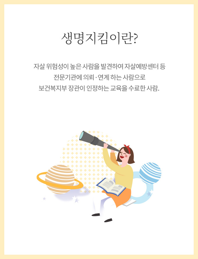 - 자살 위험에 처한 주변인의 ‘신호’를 인식하여 ‘지속적 관심을 가지고, 그들이 적절한 도움을 받을 수 있는 자원(기관, 전문가)에 연계하는 사람을 말합니다.