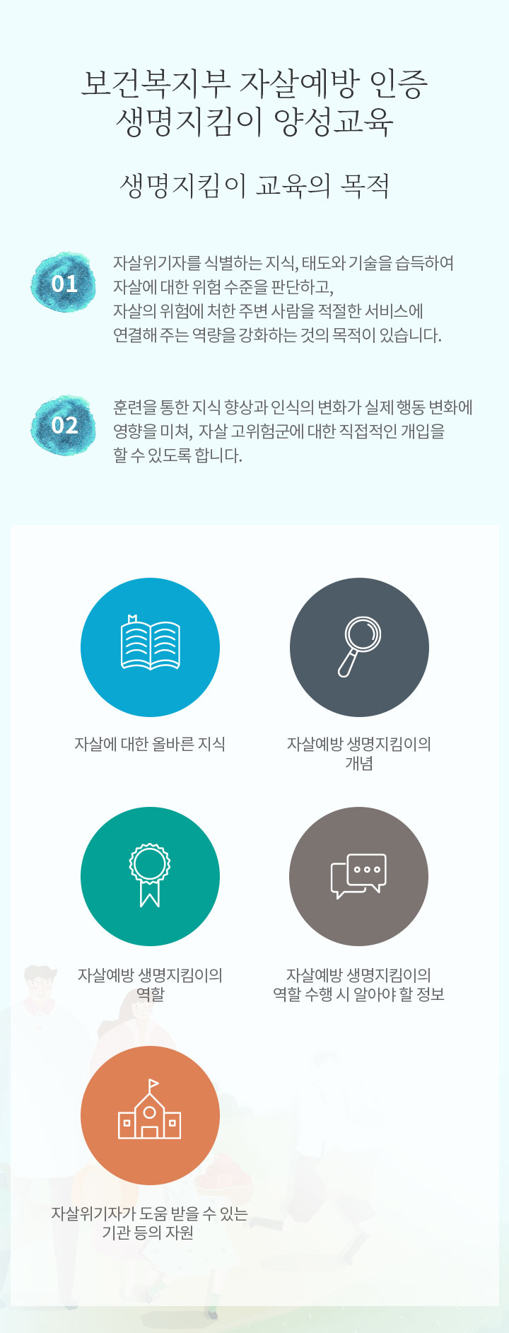 - 자살위기자를 식별하는 지식, 태도와 기술을 습득하여 자살에 대한 위험 수준을 판단하고, 자살의 위험에 처한 주변 사람을 적절한 서비스에 연결해 주는 역량을 강화하는 것의 목적이 있습니다.